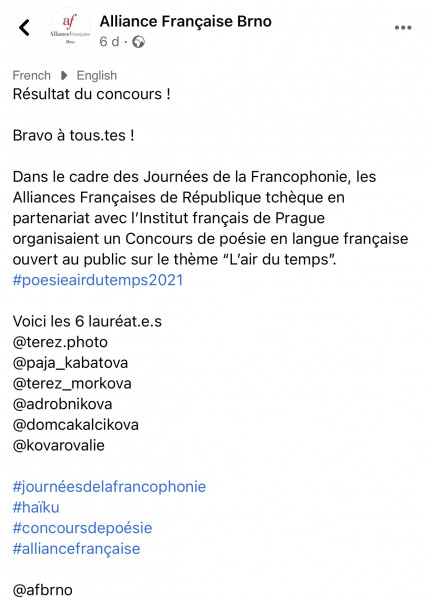 Instagramovou soutěž organizovalo ve spolupráci s Francouzským institutem v Praze společně všech šest Alliances Françaises v České republice (Brno, České Budějovice, Liberec, Ostrava, Pardubice, Plzeň), z nichž každá vybrala jednu nejoriginálnější báseň. „Top 6“ byl vyhlášen 31. března na instagramových účtech těchto Alliances Françaises.