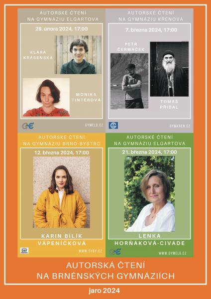 Zatímco v covidových letech mnohé aktivity přestaly a v těsně pocovidových letech jsme se vše snažili dohnat, letos už můžeme říci, že je situace stabilizovaná. Aspoň co se týče autorských čtení na brněnských gymnáziích. Letos jsme pozvali oceněné autory a autorky. Pozvání přijali Alena Machoninová, Pavla Horáková, Pavel Kolmačka a Marek Torčík.