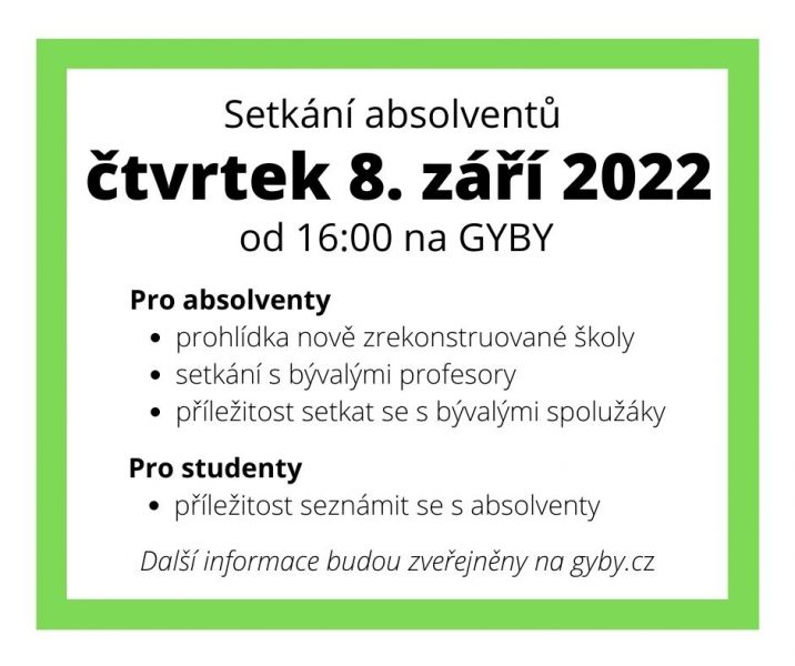 Do školy vstoupíte přes vrátnici, kde se postupně shromáždíme. Podle počtu absolventů, kteří dorazí, následně zahájíme jednu nebo více prohlídek budovy školy. V rámci prohlídky se budete moct podívat i do nově zrekonstruované laboratoře a na právě otevřenou školní zahradu. V čase mezi prohlídkami a po nich budete mít prostor se setkat s vyučujícími.