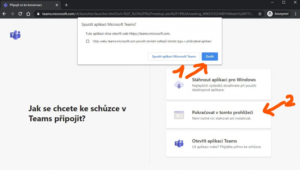 Pro připojení k virtuální schůzce s našimi učiteli si vyberte jeden z nabízených odkazů. Na všech odkazech (bez ohledu na předmětovou komisi) se dozvíte základní informace o nabízených studijních oborech, přijímacím řízení a studiu na našem gymnáziu. Ke komunikaci používáme nástroj MS Teams. Můžete se k nám připojit z prohlížeče, případně rovnou z aplikace v počítači nebo telefonu. Možnost výběru máte hned na začátku. Tento manuál dále předpokládá připojení online v prohlížeči, abyste si nemuseli stahovat a instalovat aplikaci. Nastavení v aplikaci i v telefonu je podobné tomu, které budeme ukazovat na této stránce. Ptá-li se Vás tedy prohlížeč, zda chcete spustit aplikaci, klepněte na tlačítko Zrušit (případně obdobné) a následně vyberte položku „Pokračovat v tomto prohlížeči“.
