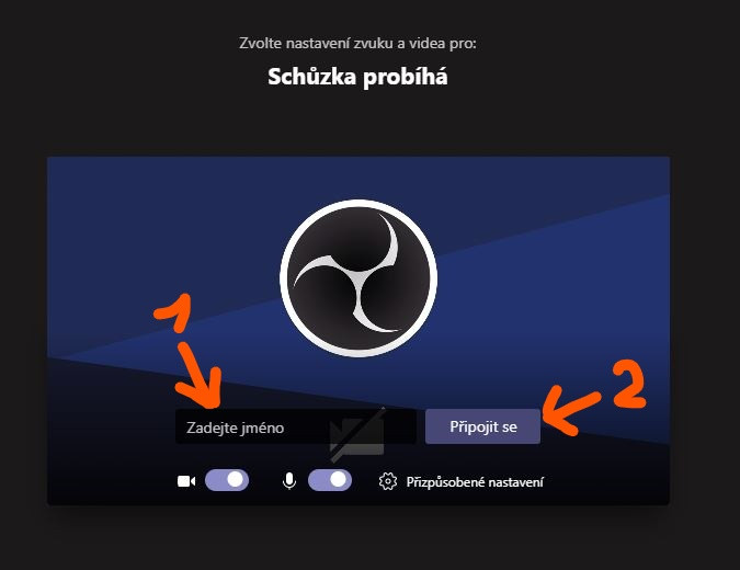 Nyní do kolonky „Zadejte jméno“ napište Vaše jméno. Můžete i přezdívku, údaj slouží jen k organizačním účelům. Následně klepněte na tlačítko Připojit se.