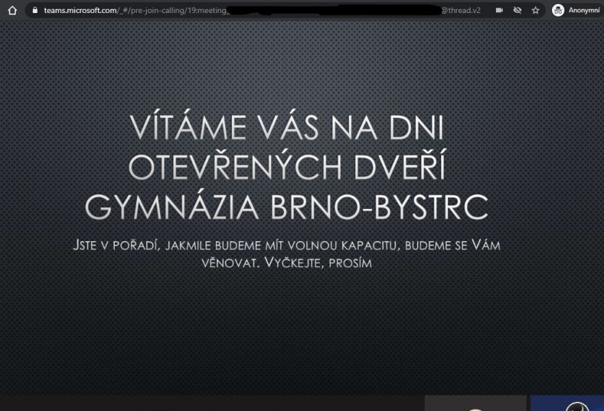 Hurá! ? Jste na našem dni otevřených dveří. Nyní prosím vyčkejte, než se Vám bude věnovat někdo z našich učitelů. Buďte prosím trpěliví a mějte na paměti jednu důležitou věc – dokud nebudete přepojeni k některému z učitelů, mohou Vás slyšet ostatní návštěvníci. Tedy, samozřejmě pokud si mikrofon sami nevypnete. Ale nezapomeňte, že jej pak zase musíte umět zapnout, abychom si mohli popovídat. ?