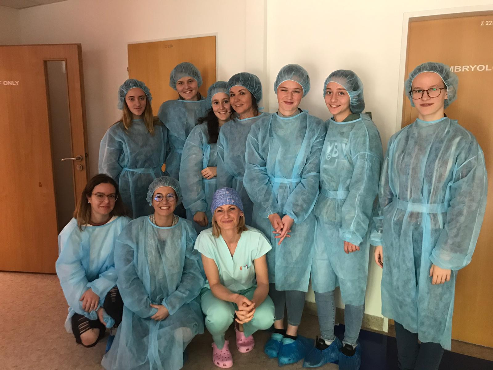 V andrologické laboratoři jsme měli možnost sledovat na preparátu pod mikroskopem životaschopnost, statistické zpracování a anomálie buněk. Embryologové nám umožnili nahlédnout na přístrojovou techniku speciálních inkubátorů, kde se oocyty kultivují v živném roztoku a po dozrání fertilizují intracytoplazmatickou pipetou. Instalovaná kamera umožňuje neustálou kontrolu všech vývojových stádií.