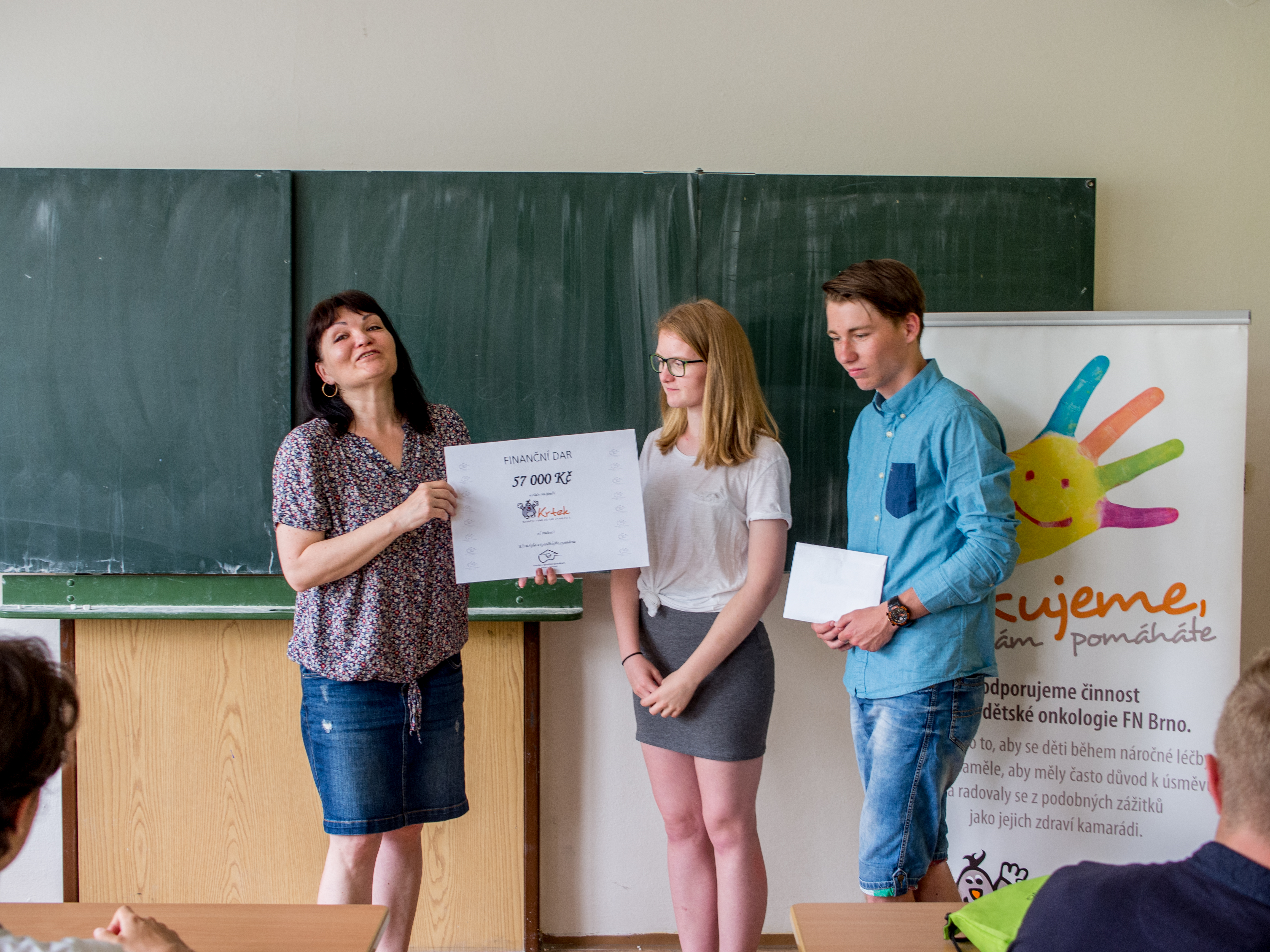 V pondělí 26. června 2017 jsme se konečně dočkali. Po přednášce výkonné ředitelky nadačního fondu Krtek Ireny Korvasové, která seznámila studenty GYBY s činností fondu i s možností, jak naši finanční pomoc využít, došlo na předávání vybraných peněz. 57 000 je slušná částka, nemyslíte? Děkujeme všem, kteří nás podpořili. Naší pomoci si váží i nadační fond: http://www.krtek-nf.cz/2017/07/10/podekovani-studentum-pedagogum-klasickeho-spanelskeho-gymnazia-brno-bystrc-2/