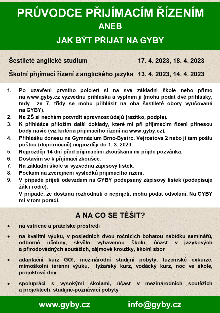 Třídní schůzky pro budoucí první ročníky se uskuteční v úterý 20. 6. 2023 v 17 hodin.