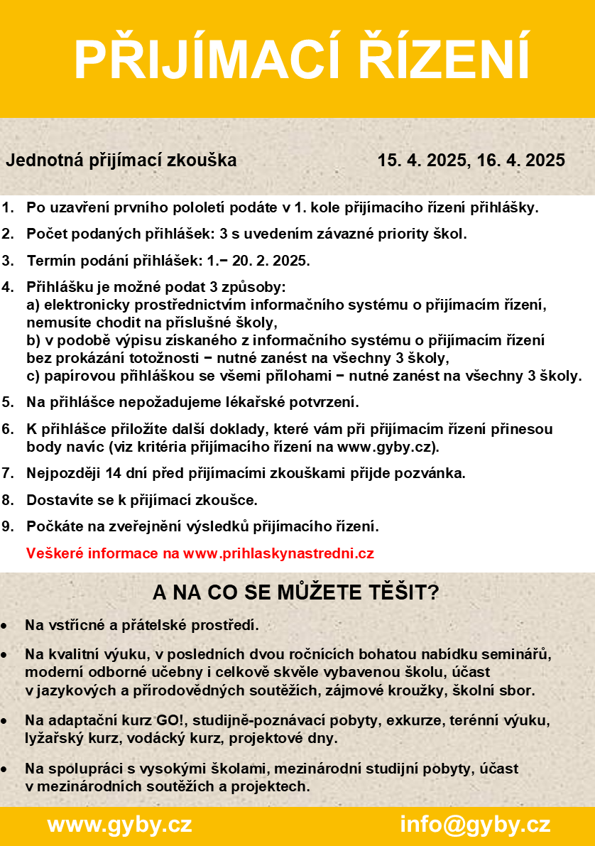 - přijímací zkoušky z češtiny a matematiky (jednotná přijímací zkouška, viz www.cermat.cz)