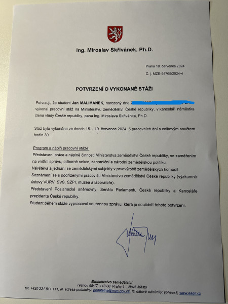 Student letošního maturitního ročníku 4B4 Jan Malimánek během svých letních prázdnin absolvoval zajímavou stáž na Ministerstvu zemědělství ČR a stal se tak inspirací i pro ostatní studenty našeho gymnázia. O tom, jak taková stáž může vypadat, nám zanechal krátkou zprávu: