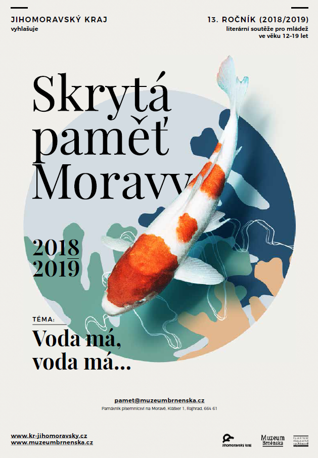 XIII. ročník literární soutěže Skrytá paměť Moravy na téma „Voda má, voda má..“. Soutěž je určena pro mládež ve věku 12-19 let, uzávěrka soutěže je 31. března 2019 a pro oceněné je připravena jak finanční odměna, tak otištění textu v samostatné literární příloze Sborníku Muzea Brněnska.