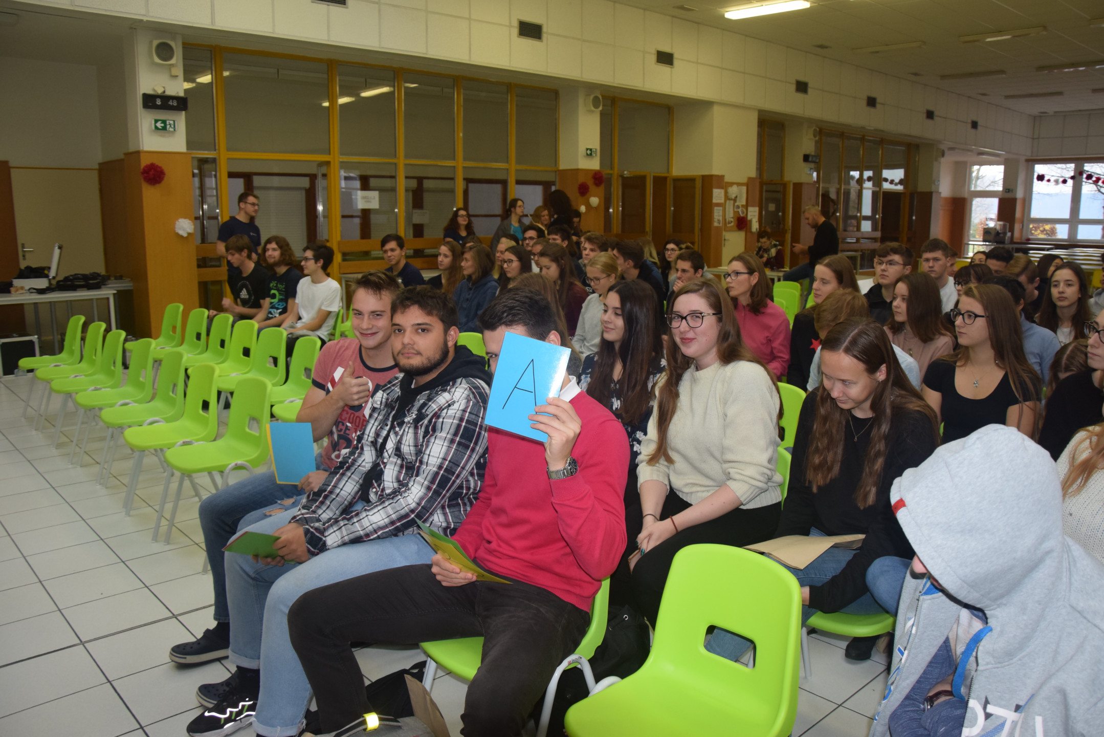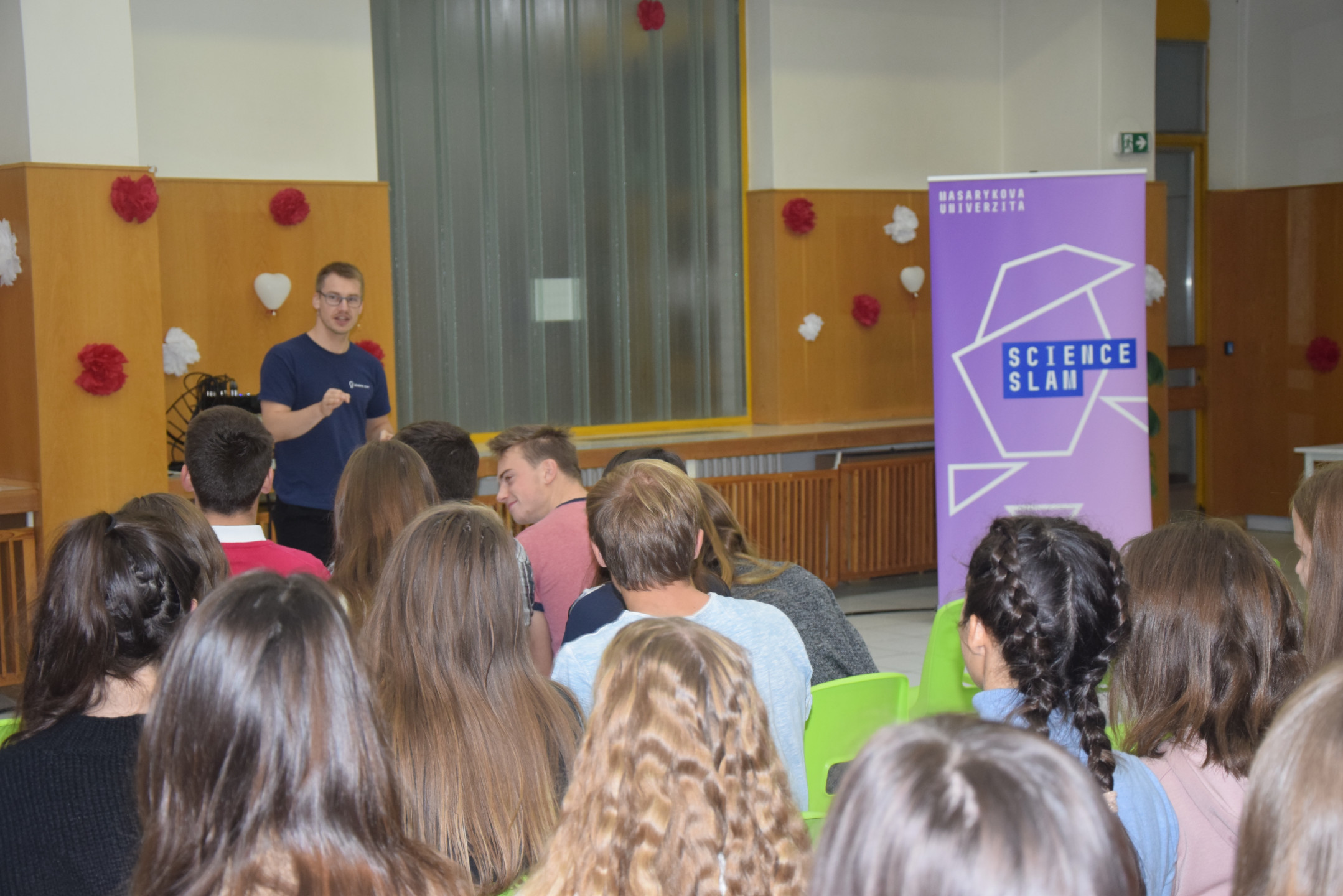 V úterý 19. listopadu jsme měli tu čest přivítat na půdě našeho gymnázia mladé vědce z Masarykovy univerzity. Už podruhé navštívili naši školu s programem známým pod názvem Science slam, ve kterém představují svou práci středoškolským studentům. Program zahrnoval vystoupení čtyř mladých vědců, kteří velmi poutavou formou seznámili publikum s vědeckou prací, jíž se zabývají. Program zahrnoval i různé interaktivní a kreativní prvky vyžadující aktivní zapojení našich studentů. Bylo skvělé, že se našel čas také na informace o studiu na Masarykově univerzitě i na individuální diskuze našich žáků s hosty z MUNI.