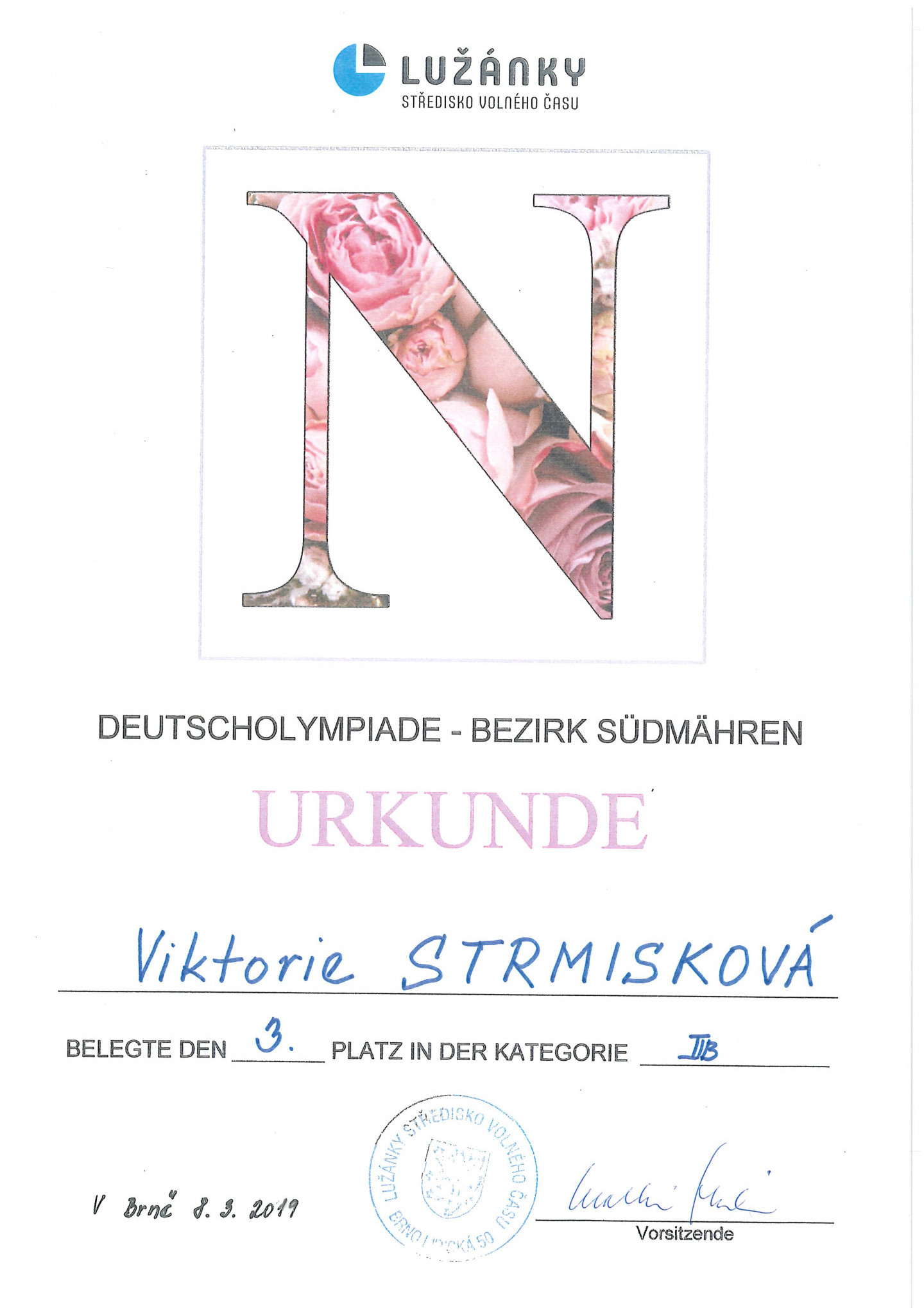Vynikajícím výkonem reprezentovala naši školu na soutěži v německém jazyce studentka 4A8 Viktorie Strmisková. V těžké konkurenci soupeřů z Jihomoravského kraje vybojovala 3. místo.