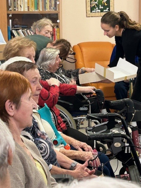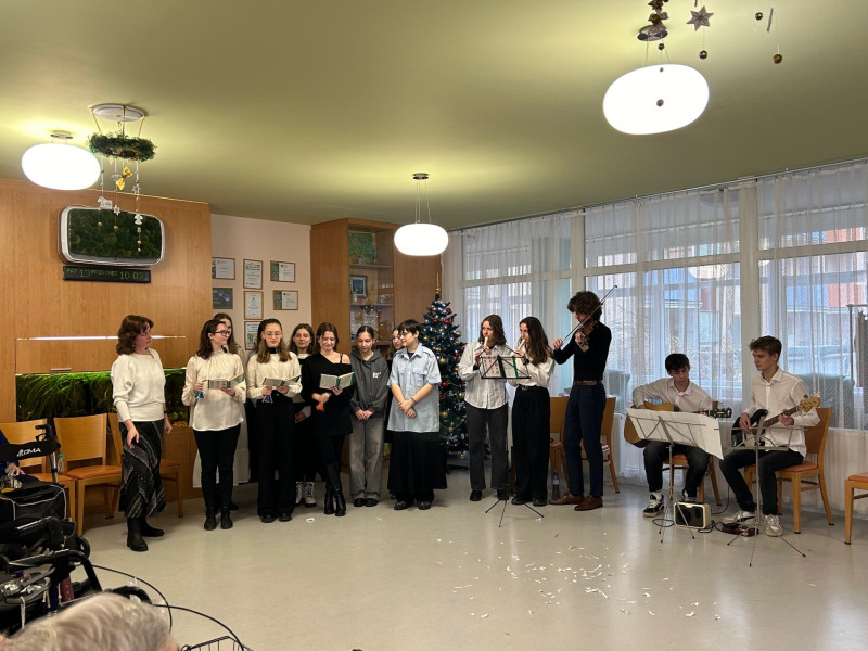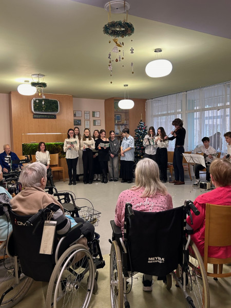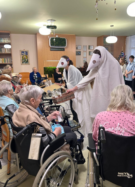 V pátek 13. prosince jsme se se skupinkou studentů vydali potěšit naše staré spoluobčany do Domova důchodců na Foltýnově ulici. Myslím, že se nám společnými silami podařilo vytvořit krásnou vánoční atmosféru – hudbou, zpěvem koled, předvedením divadla i recitací. Na závěr všechny přítomné potěšily perníčky, které studenti sami připravili. Děkujeme!